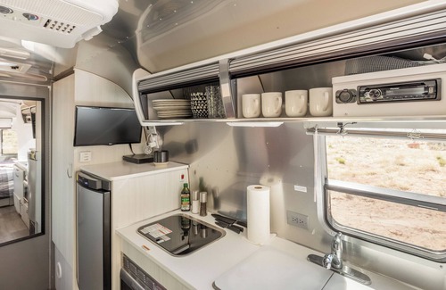 You’ll have your very own intimate cozy RV that will feel like a home away from home. This is a "Dry Unit" and does not have internal running water or toilet. Our property has a centrally located bathhouse that has 4 bathrooms with spacious, hot water and rainhead showers, toilets, mirrors and sinks 50-150ft from your Airstream. Your RV comes equipped with a mini fridge, stove, a French Press for your morning coffee as well as a fire pit and available BBQ. We didn't forget the A/C, it has that too.
