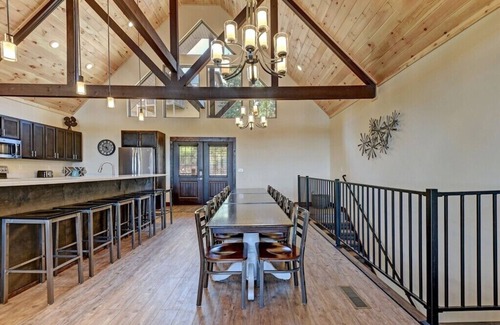Our lodges can sleep up to 32 people each with 8 master suites, ALL with king beds (14) and futon beds (2) throughout. Oh, did we mention that each bedroom is equipped with its OWN master bath as well?? Feel free to relax in the living room and basement commons areas, watch your favorite show, movie or sporting event on any of our LCD flat screen TV's (40" or 43" tv's in every bedroom with 65" in both living rooms). We are 1/2 mile from Silver Dollar City, just down the road from Indian Point Marina and only 15 minutes away from the Branson Landing, too many options to list. The dual gorgeous stone fireplaces are magnificent features, but you might miss them when you get lost in the Million Dollar View of Table Rock Lake through our 14 feet of glass and the massive 8' x 8' patio slider. You will want to hang out on the huge back deck and take a view of Table Rock Lake. Keep up on your laundry with the 2 sets (yes mom, 2 sets) of large front load washer/dryer. Prepare meals in the fully furnished kitchen. Stay connected with wireless internet, cable television. We could talk for hours, but know your time is valuable. Please click through our pics to see the amazing lodge you will be staying in. If the date for your vacation is not available, please submit your info anyway as we have multiple units in this same subdivision. Let us book your next vacation and make it the best yet!