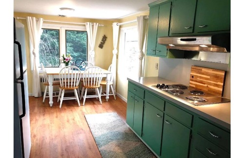 Cozy living room with fieldstone fireplace complements 3 bedrooms. Three 50+ inch Smart TVs are provided for your favorite entertainment. Fully functional retro kitchen that does not have a dishwasher. Washer/Dryer available for use.