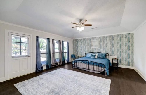 Colonial Modern Home comfortably accommodates up to 12 guests with 4 bedrooms and extra sleep spaces. The primary bedroom features a King bed, lounge chair , a 55in smart TV, a bluetooth connectible sound bar, a giant almost wall-length mirror, and an ensuite bathroom with double sinks, private toilet, hair-dryer, and a brand new oversized master shower with a rain shower-head.