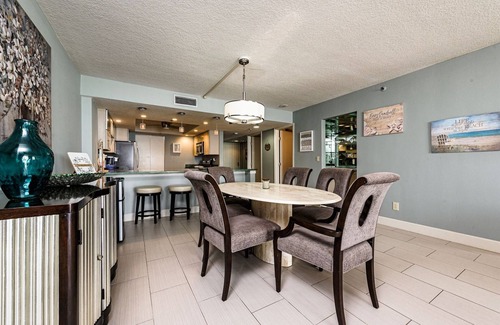 The full kitchen is equipped with everything needed to cook a meal after a long day at the beach and/or pool. The large dining table and kitchen bar provides ample room for a meals. There also is a washer dryer right inside the unit for your convenience.