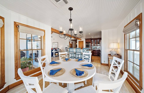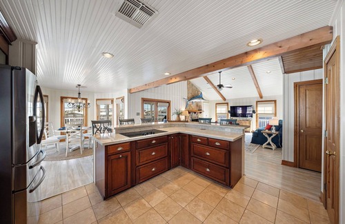Inside, the main level is warm and welcoming with an open-concept layout bathed in natural light. Vaulted ceilings with exposed wood beams, a cozy sectional sofa, and a large flat-screen TV create the perfect gathering space. The fully equipped kitchen includes stainless steel appliances, generous counter space, and bar-top seating for four, while the dining area—with seating for six—overlooks serene canal views. The stone fireplace adds charm, though it is not available for guest use.