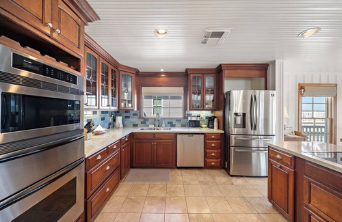 Reelview features five well-appointed bedrooms, offering flexible accommodations for families and groups. Two primary king suites have direct access to the deck, with the main suite featuring a private en-suite bath and walk-in shower. A third bedroom includes a queen bed, and the fourth is a playful bunk room with two sets of twin-over-twin bunks—perfect for kids. The fifth bedroom offers a king bed with bay views and a spacious layout. Two additional full bathrooms, including one with a shower/tub combo, provide extra convenience.