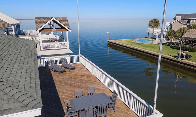 Welcome to Reelview, a charming canal-front retreat nestled in the sought-after Sea Isle subdivision of Galveston, Texas. This spacious 5-bedroom, 3-bathroom home sleeps up to 12 guests and is thoughtfully designed for families, boaters, and groups looking to relax and reconnect by the coast. With stunning sunset views over the bay, multiple outdoor living spaces, and direct canal access, Reelview offers the perfect balance of comfort and adventure.