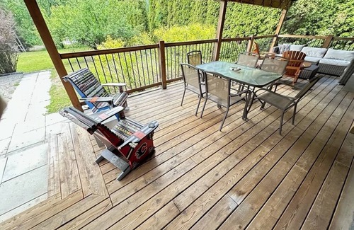 Step outside onto the inviting covered patio, complete with a dining area, ample seating, & BBQ. Enjoy the tranquility and privacy of the spacious tree lot, providing a serene setting for relaxation and outdoor activities.