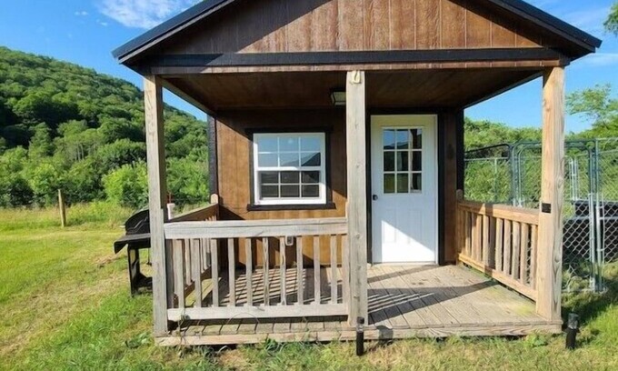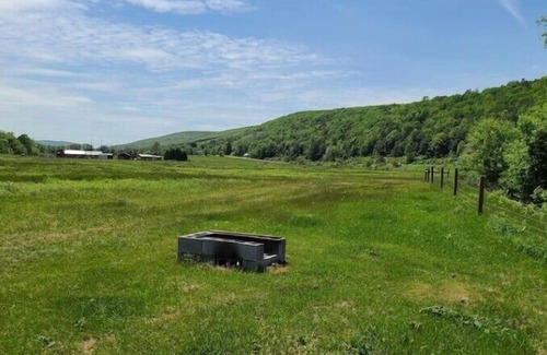 Horses, donkeys, sheep, and bulls! Surround yourself in nature and our ranch animals! Cabin situated between animal pastures and beautiful valley views! Halfway between Corning, NY,and Watkins Glen, NY. Explore Corning or the finger lakes wineries or hang out and enjoy the peace and serenity. Take a hike on our 107 acres. This is an off grid cabin, there is a clean portable toilet steps away outside. Our quiet invertor generator is available for a small rental fee if needed.