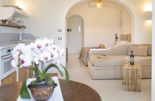 Brand-new Deluxe Studio, characterized by refined architecture and high-comfort details, consists of a sleeping area, an equipped kitchenette and dining area with sofa, a bathroom with shower, and a wide, furnished terrace with a stunning sea view. A comfortable accommodation for up to 3-4 people. The rates include air conditioning, water, gas, electricity, use of the swimming pools, deck chairs, sun beds and umbrellas, parking, WI-FI, unlimited entrance to the botanical garden, tidying-up and change of bath linen every 2 days, and weekly change of bed linen.