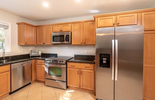 From coffee to a sit-down meal, you will find everything you need in this well equipped kitchen with plentiful countertop space and pantry storage. Kitchen amenities include: Keurig coffee machine, drip coffee machine, electric tea kettle, toaster oven, blender, slow cooker, and ice maker. A propane gas grill is available for use in the backyard. The dining room features a large dining table that comfortably seats 6 people.