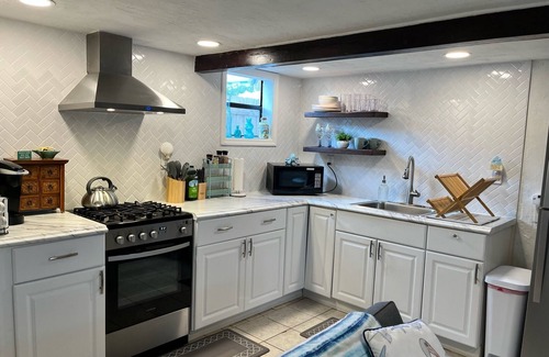 The Ocean Breeze Suite is on the first floor of a two-story guesthouse. The guesthouse has an exterior entrance (there are 2 steps), which leads to a shared space (where guests have access to a washer/dryer). From there, you will find the interior entrance to your unit.
