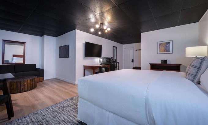 Deluxe King Suite rooms feature a king-size bed and full-size sleeper sofa, luxury bedding, one bathroom, a mini-fridge, Keurig coffee maker, and flat-screen web-enabled TV with complimentary access to Disney+, Hulu, and ESPN+. Select Deluxe King rooms are pet friendly.