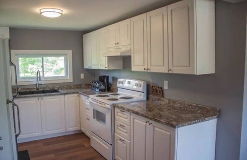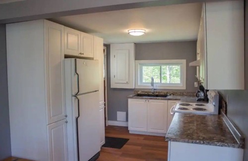 A completely separate walkout basement apartment has been added to the cottage which allows space for 6 more guests (the only access to the basement is from outside, there is no staircase connecting the 2 spaces from the inside). This space has 2 bedrooms, both with double beds, and a pull out couch in the living room. The basement is equipped with a full kitchen (fridge/freezer, stove, microwave, toaster, sink, coffee maker, plates, cutlery, etc), 4 piece bathroom (sink, toilet, shower, and bathtub), smart TV, and small kitchen table with 2 chairs.