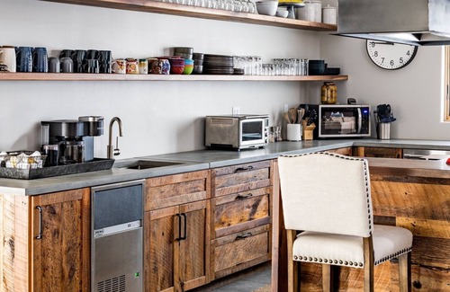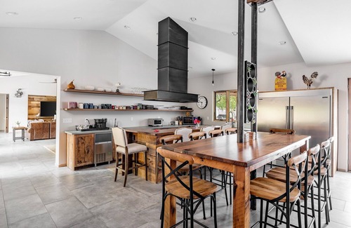 Inside the home will surely not disappoint! The endless touches of barn wood and metal create a sense of organic warmth and comfort in a home with modern and sleek design finishes. The floorplan is ideal for larger groups of up to 20 guests. On one wing of the home, you will find four large bedrooms each with a king bed. Three of the four bedrooms have their own en-suite bathroom. The other side of the home houses two large bedrooms with queen beds and the bunk bedroom, containing three queen beds and seven single beds (perfect for the kids). There are two other bathrooms on this side, one of which has two showers and two toilets. Splitting these two wings is the entertainment space. One of the two living areas is equipped with a large chef's kitchen with high-quality appliances, a large living room with wall TV, a shuffleboard table, foosball table, seating for in-home dining, and an abundance of board games. The other living area contains a billiards table, another sitting area with wall TV, and game tables.