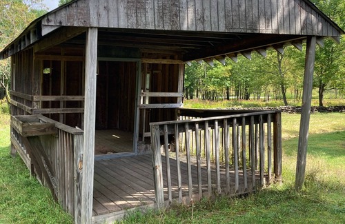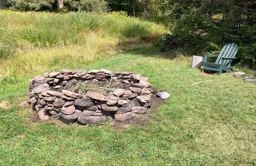 Visitors access the furnished room through a large garage, which provides a very convenient flat, dry, lighted staging area for hikers, campers, skiers, and hunters, and a creative space for artists. The cabin is located on a very private 10.5 acre lot, which features a gigantic stone fire pit, a 100 foot spring fed pond, an old cottage/gazebo and an outhouse. Long mountain views from the fire pit and pond. Private driveway leads to the cabin and offers close by parking.