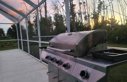 There is a large covered patio area with lighting and ceiling fans for al fresco dining with a table and six chairs. A gas powered BBQ is available for your use. Sun loungers are supplied for soaking up the Florida sunshine.