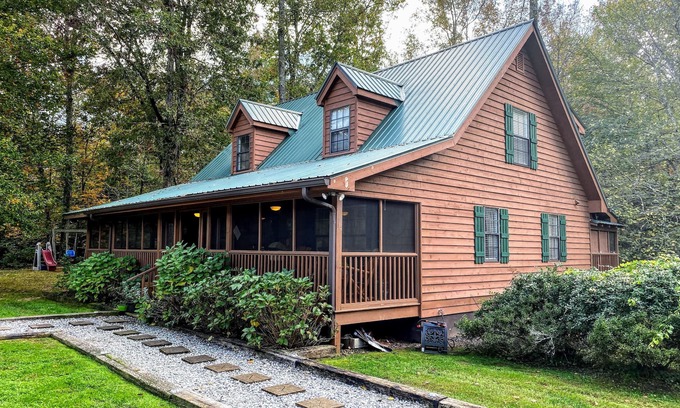 Our mountain cabin was built in 1997. It has 3 bedrooms, 2 bathrooms, a large living area, and a kitchen and dining area. Nearly 1000 sq. ft. of wrap around screened in porches to take in the fresh mountain air and sounds of running water. When you're ready to relax after a long day of exploring all the area has to offer, slip into the hot tub with a glass of wine or make s'mores by the camp fire out back.
