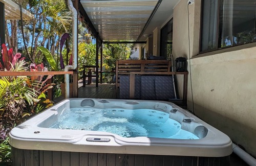 Relaxing back veranda with lounges, dining area, and baby weber BBQ. The front veranda has Balinese day bed overlooking a nature reserve. However, the front veranda doesn't have child-proof railings - not suitable for infants crawling or toddlers. The outdoor Spa is next to the front veranda.