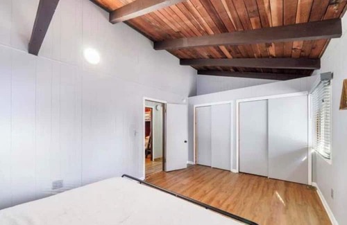 A cozy, bright room on the second floor with a queen-sized bed, spacious closet, and a mirror. Enjoy serene woodland views from the window for a tranquil stay.