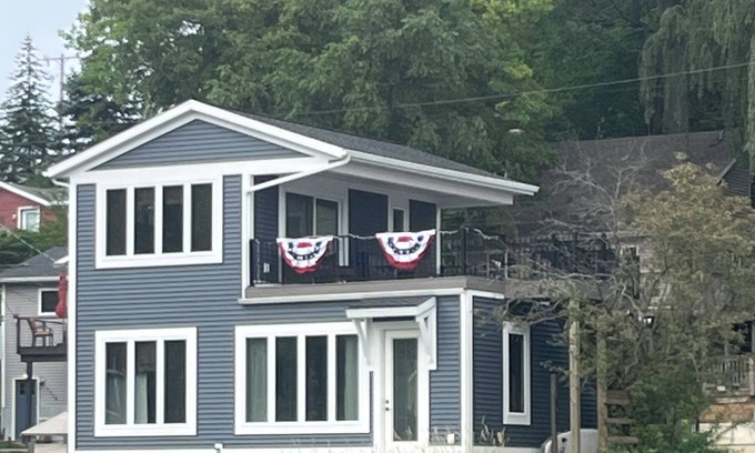 This two story lake house is right on the waters edge of Big Pine Island Lake, near Belding. New construction, built in 2021. The kitchen and living area features large windows facing the lake. The house is a little over 1040 sq ft, with a large upper floor deck facing west to catch the sunsets over the lake.