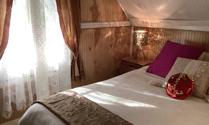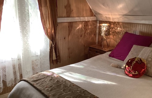 Upstairs bedroom/office suite in Victorian cottage in a great location, a secluded, private community in a wooded country setting in Jamesport, walking distance to 6 wineries, 5 fine restaurants, the Peconic Bay beach, antique shops, and the village and a short drive to farms, the Hamptons, the ocean and shopping including Tanger Outlets mall.