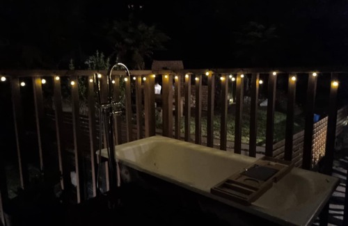 The property is pet friendly, and has a fenced section. Guests have access to a large deck, wood BBQ and outdoor bath.