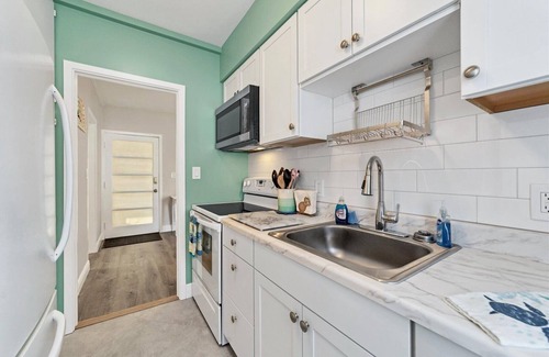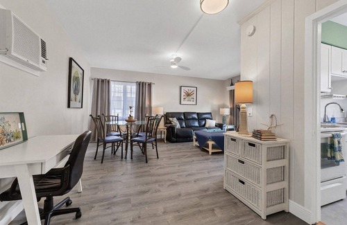 Nice spacious ground floor one bedroom apartment. Just remodeled with new kitchen and bathroom. Front and rear patios. Walk to everywhere in South Side boutique village. 20 restaurants and gourmet grocery store all within 5 minutes walk. Bikes and kayaks available too!