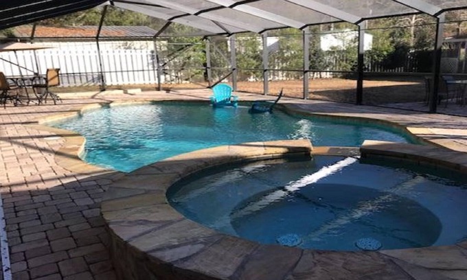 Have a blast with your own resort nestled in the backyard starting with a large Private, Spacious Gunite Saltwater Swimming pool with an 8 person hot tub and a very large screened enclosure. The pool is 3' deep to the deepest being 5'. The pool averages 16' x 32' in size. The pool can be heated for an additional charge. Ask when booking!! Enjoy laying out in the pool on the nice tanning ledge or spend hours having a blast playing Aqua Volley inside pool.