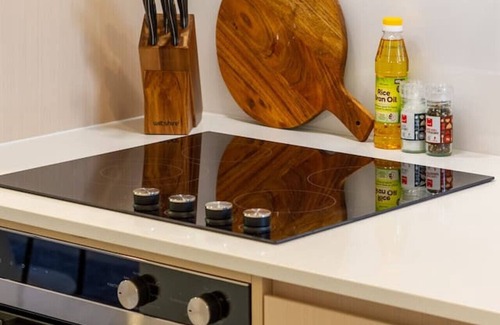 The modern kitchen is equipped with high-end appliances, cookware, and all the essentials for meal preparation. Additional items include instant and plunger coffee, black and peppermint tea, drinking chocolate, milk, sugar, salt, pepper, and a selection of sweet treats.