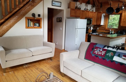Two bedrooms on main floor with 1 Queen in each. Loft has 2 full size beds. TV/DVD, Washer/Dryer. Full kitchen (no dishwasher), hardwood floors and tastefully decorated for a cabin feel. Deck overlooks river. Fish from your front yard! Put your feet in the river and watch the canoes and kayaks float by. Enjoy an evening campfire while listening to the sound of the river. Begin your canoe/kayak adventure from the front yard!