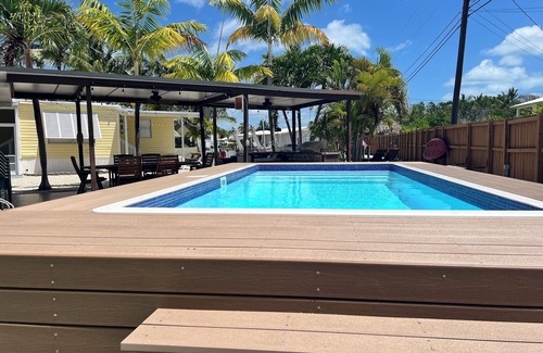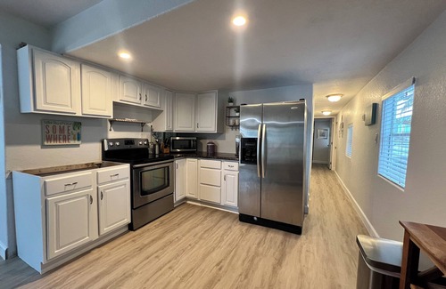 Fully Renovated home. Peaceful and private backyard; with plenty of space to relax and unwind. Mater bedroom, with a queen size bed and shower bathroom. A fully equipped, kitchen open to living room, perfect for entertaining guests. Large screened patio, sitting area and your washer/dryer. Pool with lounge deck, an outdoor kitchen area equipped with all your needs for grilling. Private canal on end where you can dock your boat, jet ski. There is a fish cleaning station, umbrella tiki, hammock, propane fire pit, bicycles, kayaks and paddleboard available.