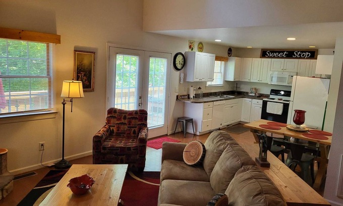 Overlooking Helen, our Alpine Cottage is comfortable, cozy and ready to host up to 8 guests. The cottage is located within walking distance to Helen, down a stairway to main street. The home offers a full kitchen, dining area, four bedrooms and a hot tub! The back patio offers privacy and a scenic view. Enjoy easy access to the best of Helen, river tubing, mountain coaster, shops and eateries. It's all within a short walk from the Alpine Cottages at Helen!
