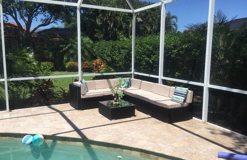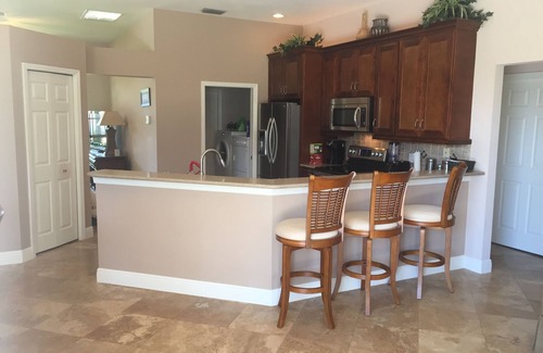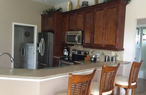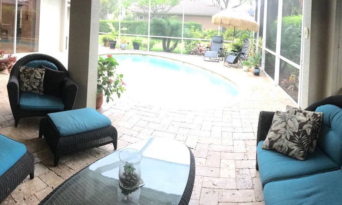 A beautiful home located in the secure and gated Golf community of Gateway Golf Club. The home is in excellent and pristine condition with all the modern touches and amenities. Nearly every room in the home has been upgraded with modern paint, new flat panel TV's, tile flooring and quality furnishings. All 4 bedrooms decorated with modern colors and mostly new beds and furnishings. All 3 full baths have been renovated with tile flooring, modern fixtures, and tile/glass showers. There is a top of the line kitchen with stainless steel appliances and granite counter tops. Modern decor living, dining and bedrooms, and a fantastic yard with heated pool, lanai and outdoor sitting area with HDTV. Great for evenings under the stars sipping your favourite beverage or watching the big game. The house is over 2000 square feet, so there is plenty of room for the family or to entertain guests. Just steps away is the highly rated Tom Fazio designed and award winning golf club named Gateway Golf Club. You won't be disappointed with this house or upscale location. 5 minutes from Interstate 75. 10 minutes from Ft Myers airport (RSW). Very close to Jet Blue Park, downtown Ft Myers and Ft Myers beach. So many amenities close by including shopping, restaurants and entertainment. If you are looking for a winter residence with Golf this is it. Long term renters are encouraged - discount available for long term renter. Walking distance to the driving range and golf course. The Location is the gated community of Gateway Greens, steps from Gateway Golf Club.