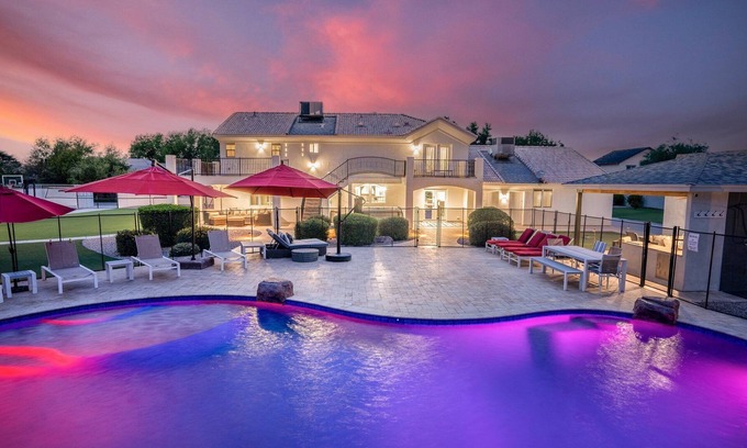 Escape to a luxurious vacation retreat in the heart of Gilbert! This breathtaking private rental is just a 15-minute drive away from Downtown Gilbert's popular shopping and dining destinations, making it the perfect location for your family gathering, business retreat, golf trip, bachelor/ette celebration, or a relaxing getaway. As you enter the property, you'll immediately be mesmerized by the one-of-a-kind backyard. The resort-like setting boasts a heated pool (+$100/night - please request at least one week before arrival), built-in waterslide & pool basketball hoop, spa, trampoline, volleyball & soccer field, basketball, tennis, & pickleball court, hammock, playset, putting green, outdoor shower, bocce, cornhole, and more. You'll find everything you need to relax, rejuvenate and have fun with your loved ones. The home itself is a two-story masterpiece and detached casita, with 7 spacious bedrooms, 6 bathrooms, and thoughtful design touches throughout. The space also features a detached game room and fitness center, equipped with a pool table, ping pong, shuffleboard, foosball, an arcade game, electronic darts, giant connect four, and a variety of exercise equipment. You'll never run out of things to do; with so many amenities and attractions, you might never want to leave this stunning property!