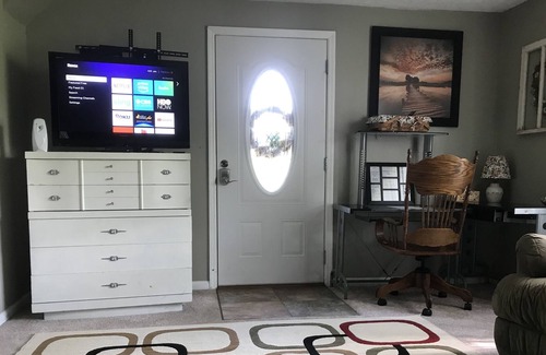 Guests have a private entrance with a keypad lock and unique code and will use a separate and private driveway that offers space for 3 cars. For larger groups that have more than 3 vehicles, arrangements can be made to use the hosts’ driveway for overflow parking. A full size kitchen features many amenities to make guests feel comfortable and at home with the conveniences of appliances and necessities without having to pack those. There is a full size dishwasher, an electric range with a double oven, full size microwave & lots and lots of cookware, dinnerware, silverware, glassware, serving and baking dishes/pans/sheets, a 10 cup Bunn Coffee Maker, a Keurig (with pods in popular flavors) an Electric Water Kettle and tea bags and cocoa, 3 slo cookers (sizes -small, medium and large), a rotating Belgian waffle maker, an air fryer, a large blender, a hand mixer, an install, several drink pitchers, a Zero Water large container keeps filtered water easily accessible and cold in the full size side by side refrigerator/freezer with ice maker and filtered water in the door. Guests will also have access to the exercise equipment.