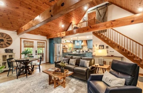 This newly renovated cabin features modern amenities, new furniture, beautiful décor and ample outdoor entertainment space. Even though you are in the middle of the woods, you won’t be roughing it at all! The house is well appointed with 2 bedrooms, one with a king size bed and one with a queen size bed. (Bathroom is on 1st floor near queen bedroom). Perfect for one or two couples traveling together, a friends getaway, or a family of four who need some quality time!