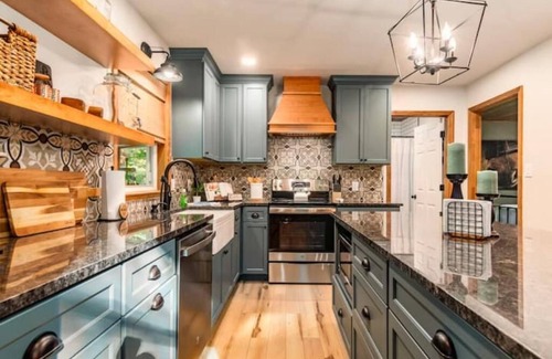 Amenities in the fully stocked kitchen include filtered water through the refrigerator, dishwasher, electric stove and microwave. Small appliances are also included such as a blender, crock pot, waffle iron and toaster. A coffee pot with both a Keurig and a standard size pot is provided as well as k-cups, coffee grounds, sweeteners, creamers and tea. Paper towels, dish cloth, dish rag, dish towel, dish soap, zip lock bags, salt, pepper, cooking oil, spice rack and napkins also provided. Need square or round ice cubes for the bourbon you just purchased? No problem! We have special ice trays in the freezer for you! Bourbon glasses are in the cupboard too!