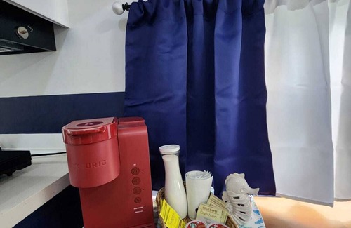 It's parked on our farm with private entrance and fence. It has a queen bed with foam mattress, a/c, 2 TVs, a sofa, a dedicated workspace, high-speed internet, a dining area and a full bathroom.