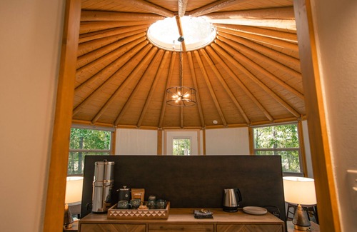The Agave is one of our unique luxurious yurt cabin with a King bed, Our exceptional amenities and en-suite private bathroom guarantee first-class comfort.The expansive 450 square foot open floor plan with a lodge-pole pine ceiling and skylight brings you closer to nature. The full size private bathroom is flooded with natural light and offers a walk-in shower with teak flooring!
