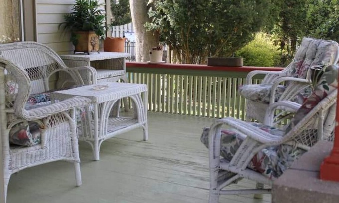 Queen-size bed with pull-out loveseat sleeper in the main room as well as a rollaway bed in the closet, plus a dining table. Set of bunk beds in adjoining bunkhouse. Private entry area between the main room and bunkhouse. Kitchenette with microwave, coffee pot, & mini fridge hot pot, toaster oven, toaster, and all utensils, and dishes. All bedding and towels are provided. Private bath. Includes free wifi, Cable/Smart TV, Sauna, & Pool / BBQ Grill Access.