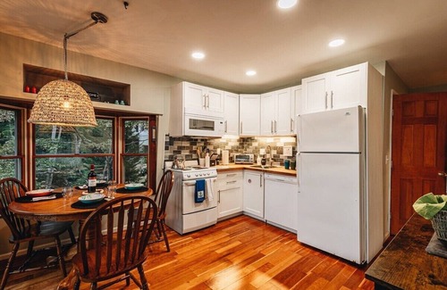 Returning inside, the second full bath is on the right and another queen bedroom is on the left. Continue to the kitchen that opens to the dining and living areas, and the enormous picture windows that look out on the river. (the kitchen counter top area is on the small side, but you can move the rolling cart to the center to create a lot more space). Throw open the sliding door on the deck and breathe the fresh air! This is why you came. The view from this level is nothing short of stunning. Relax on the couch, head out to the deck and claim a lounger, or fire up the bbq on the deck and turn steaks while daydreaming about how you might move here full time!