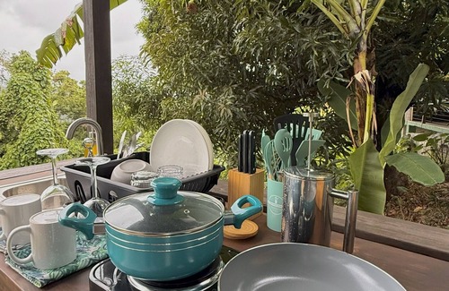 The kitchenette is equipped with a 2-burner hotplate, microwave, electric kettle, mini-fridge, pots, pans, and all the essentials for preparing simple meals. Guests love cooking breakfast here and enjoying it outside while hummingbirds dart around the feeders. A hammock and outdoor seating make the balcony one of the most memorable places to spend time.