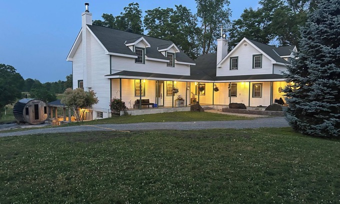 Begin your day at Amberleigh Farms, a peaceful 183-acre regenerative farm retreat, with a quiet coffee on your covered porch as sheep graze close by. Enjoy peaceful walks on the scenic K&P trails that are adjacent to the farm, breathe in the fresh country air and learn about the farm during a personal walk-about with your engaging host. Let the stillness wash over you as you catch up on your favourite read in a hammock, ground yourself & connect to the earth or roll out your yoga mat for a soothing stretch in nature. Dine al fresco, unwind in the wood-fired barrel sauna, cool off in your very own "cool" plunge then stargaze by the fire. The Guest Lounge located in the lower level of the Guest House provides a relaxing games area, 2 additional modern private washrooms, laundry facilities, walking sticks and snowshoes for winter. Amberleigh Farms is a restful, rural escape where time slows—and nature surrounds. Breathe deep, slow down and feel the earth again! the lower level.