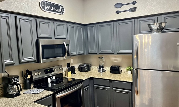 Master Bedroom offers nice King size bed, 2 nightstands with built in nightlights, large TV. Spacious Master bath has shower & separate soaking tub with spa items included for all guests.