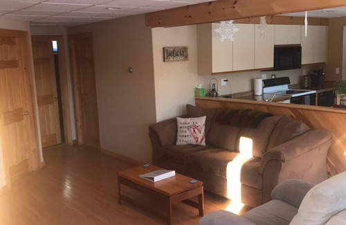 This is lower level unit with stairs to access the unit. The open plan layout is open and light floods in through the windows along the front wall. The space is perfect for families, skiers, or anyone who just wants to get away from the hustle and bustle to enjoy the scenery of Vermont at its finest. Jay Peak Ski area is only 15 minutes away with hiking, skiing, ice skating, golf and the largest indoor water park in Vermont. Newport, Vermont and all of its amenities are just 30 minutes away. Stowe, Vermont is a nice 45 minute ride and Burlington is just a little more than an hour away. The Vast trail is only minutes away also. You will get the feel of Vermont staying here with the pine and cedar accent walls throughout the apartment while you are surrounded by the campfires and trees right outside your windows. This apartment has two bedrooms, one huge bathroom with a washer and dryer. You also have an open layout for the living and dining area. The kitchen includes a full-size fridge, stove, oven, microwave and a dishwasher with lots of counter space. We have a king Bed in one bedroom (can turn into two twins if needed) and a double bed in the other private bedroom. The living area has a pull out couch available for sleeping also.