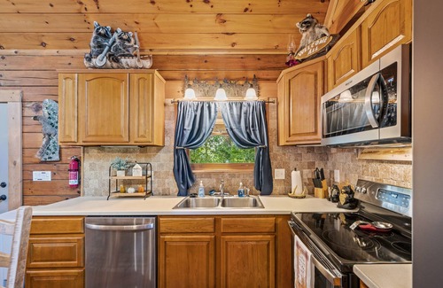 The fully equipped kitchen invites you to prepare delicious, hearty meals with all the modern appliances you need. Complete with a full-sized refrigerator, dishwasher, stove, microwave, and other kitchen appliances perfect for making breakfast, lunch, or dinner throughout your stay! All pots, pans, glasses, plates, silverware, etc. are also there for you! Share your culinary creations at the dining table, where you can relish not only the flavors but also the mesmerizing wooded views just beyond the windows. Or, take your culinary creations outdoors to the deck, where you'll find a barbecue grill, allowing you to create delicious meals amidst the crisp, mountain air.