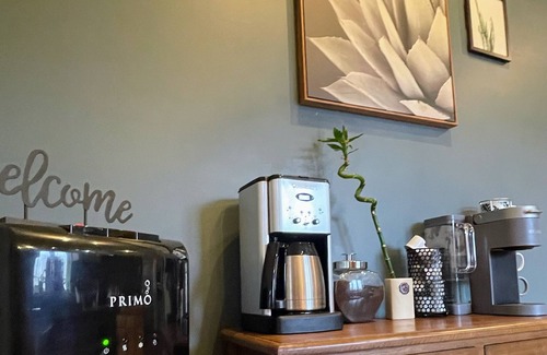 Full size kitchen and dining room with coffee bar and Farmhouse table in dining room. There is a drawer by the stove that has spices and a cabinet that has oils and vinegar. There are also baking items.