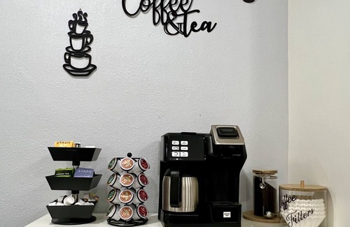 -Coffeemaker with two choices to meet your requirement for either grand or K-cup coffee, tea, sugar and cream are provided as well.