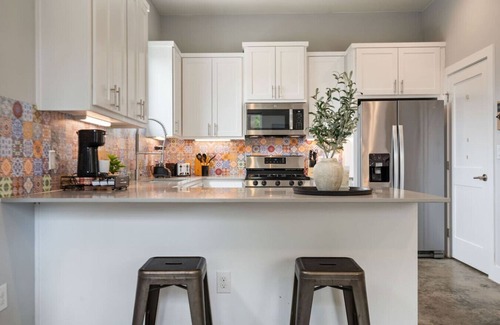 Kick back in this colorful Austin escape featuring a private cowboy pool, BBQ grill, chill backyard oasis, and EV charger! Stay where the action is—just 8 minutes from the airport, less than 15 minutes to Downtown bars, eats, and music, and 15–20 minutes to COTA for races and concerts. The main house has a king bed and full bath downstairs, plus two twin beds, a full bath, and a desk upstairs. The casita brings extra charm with a queen bed, twin bed, and desk. (Heads up: Casita guests use the main house bathroom—so please don't lock the living room door, or they’ll be doing the potty dance!)