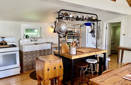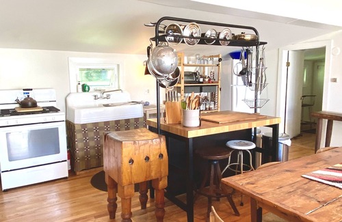 Two, private bedrooms with one queen and one full bed. Wood burning stove with plenty of firewood, and a stocked kitchen; everything you need for cooking gourmet meals.