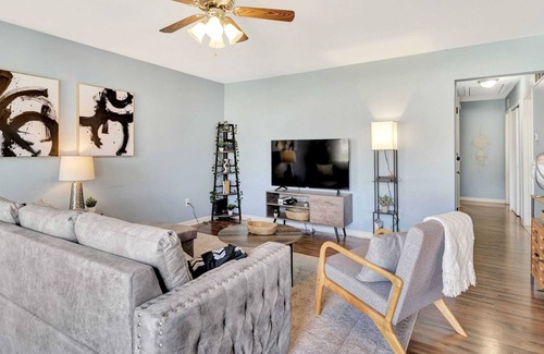 Our welcoming living space is an open concept between the living room and dining room, creating a perfect space for socializing and relaxation. The living room is furnished with a comfortable sofa and a smart TV with access to regular channels, as well as other apps such as Hulu, Netflix, and Apple TV. So whether you want to watch a movie, catch up on your favorite TV show, or simply relax after a long day of exploring the area, the living space is the perfect place to do it.