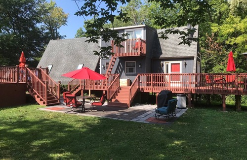 Reconnect with nature at this secluded, comfortable, cozy and unforgettable pet friendly escape (please register your pet), nestled by a beautiful brook and (incredibly) right next to The University of Findlay campus. A-frame with loft bedroom offering a queen size bed (plus two additional sleeping options), air conditioned and heated with mini-split HVAC as well as a wood burning stove and electric baseboard heat, large deck, patio, grill, secure electronic lock and 24' diameter above-ground SUMMER pool and deck. Fully equipped kitchen, private bathroom with shower, two TVs, laundry room and free high-speed internet. Professionally cleaned.